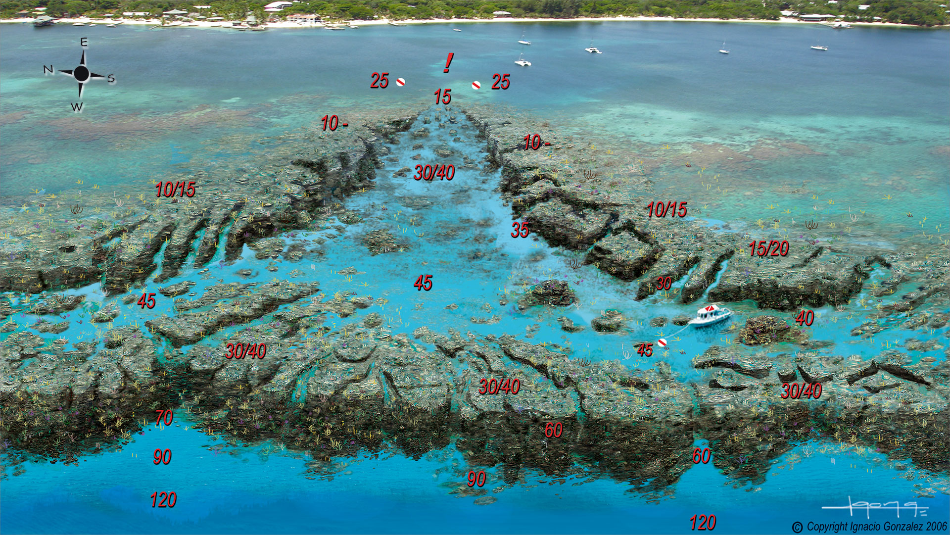 Following the Eel Grass and algae-covered bottom to the northwest, you will find the narrow entrance to the channel at 15 ft. Going seaward, the algae bottom becomes sandy with sparse coral heads encrusted with Mustard Coral.