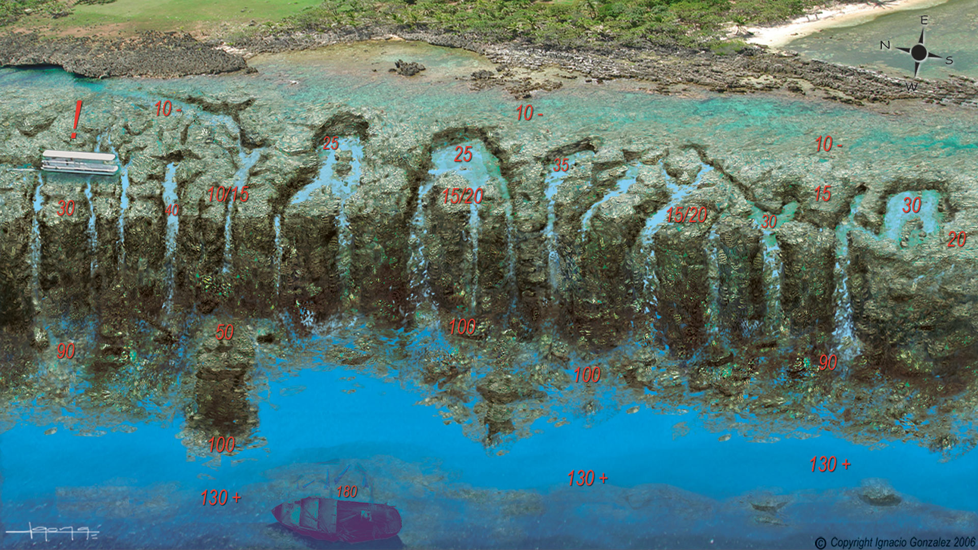 The reef’s crest is adorned with a vibrant mix of stony corals and gorgonians (sea fans), which cascade down the face of the wall. At a depth of 90 feet, the base of the wall is lined with coral outcroppings that gradually transition into a sandy bottom sloping into the depths.